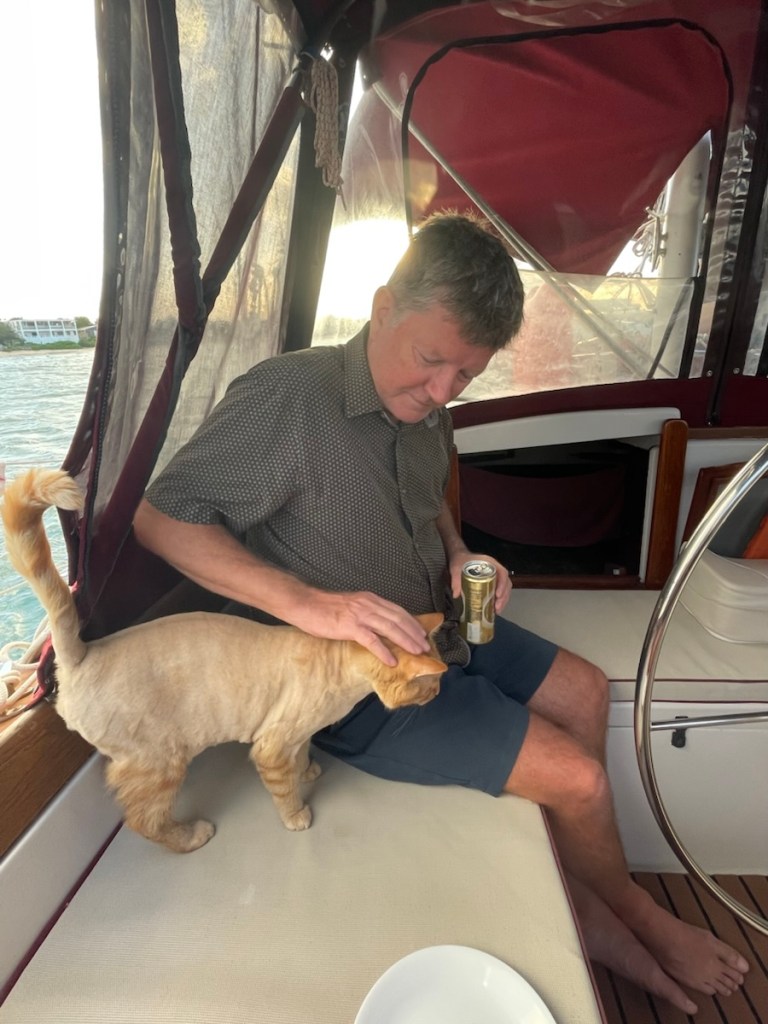 Mark and I spent Friday and Saturday relaxing on the boat. We didn’t even lower the dinghy – just read our books, watched stuff on our devises and truly did very little. We did go for a swim on Saturday which was super nice. The wind had finally dropped enough so that the waves had died down too. This wind sure has lasted a long time – longer than was predicted!