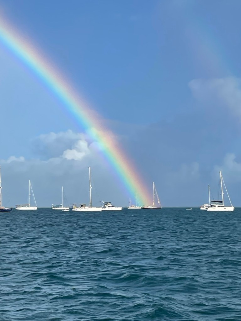 Monday morning rolled around and we still had gusty wind – gusts in the low 20 knots. That’s not the best for trying to get onto a dock that happens to be at the mouth of the canal that leads to the French lagoon. So we decided to check how much water was in the bow tank – if we had enough, we could wait until Tuesday morning (wind predicted to be low) to go to the fuel dock. Well we had less than 10 gallons in that tank!! Yikes – time to go get water. We pulled up anchor and headed to the dock around 9:30 am. Mark had no problem getting us onto the dock. We filled both tanks and all my little jugs (5 – 1 gallon jugs) and were ready to get off the dock around 10am. That was a bit trickier with wind and current pushing us onto the dock but Mark skillfully pulled away from the dock and turned us around to go back out the entrance. We were anchored in our previous spot by 11 am.