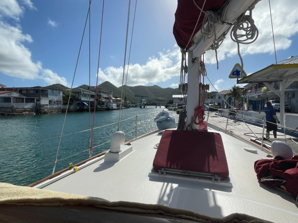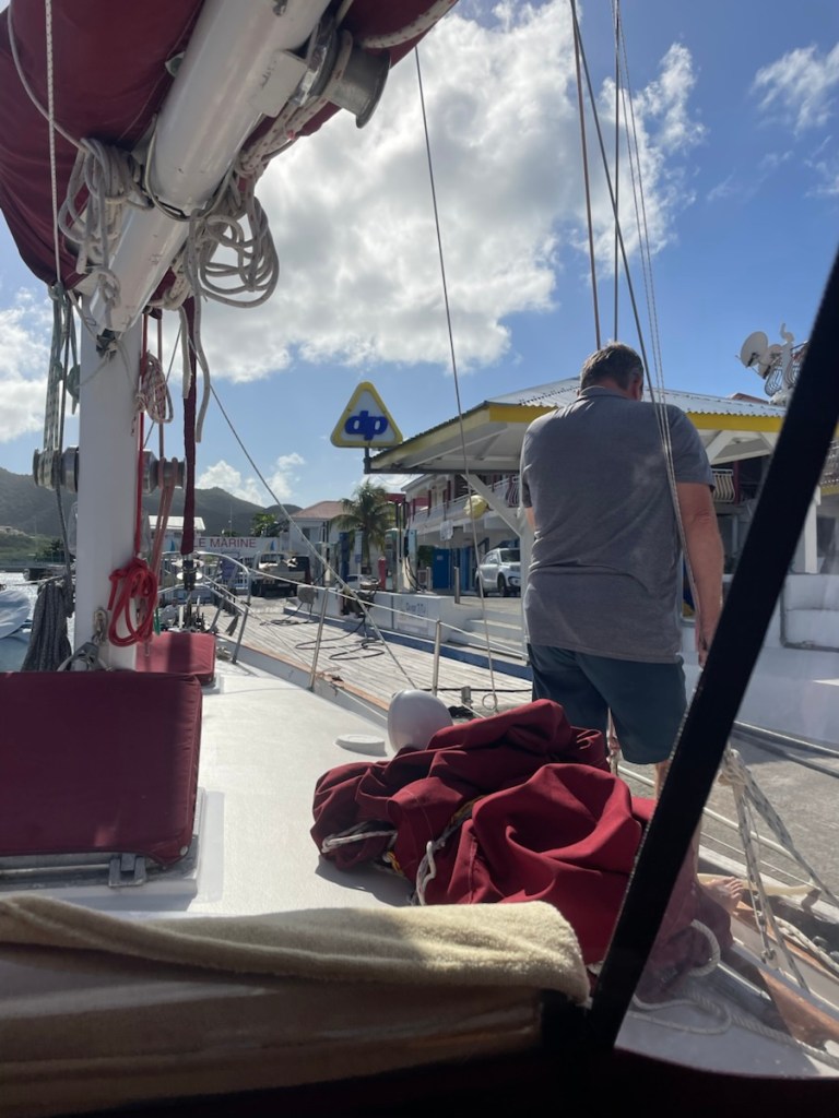On Sunday (Jan. 25th), we needed to make water again. In order to keep the membranes of our water maker in good condition, you are supposed to make water every 7 days. It also turned out that we were down to about 5 gallons in our starboard tank! Mark got the Honda generator all set up and we had the water maker all ready to go. Unfortunately the generator had a different plan – it stopped working…again!! Same problem as before where it runs at an idle but won’t generate any power. Mark took his tools to the stern (where the generator lives) and disassembled the whole thing (well as much as he could). It took several hours and a bit of cursing but in the end, the Honda wouldn’t even start (let alone run at an idle). Okay that’s not great!! No generator – no making water. We had to pickle our water maker membranes using our house batteries and the desalinated water I put in jugs (it’s our cold drinking water that we keep in the fridge). We’ve never done this process this way before but it worked well. It’s a good thing our batteries were well charged after a windy night!! Okay so water maker problem solved – great. We decided to not take the generator back to Electec because there is a Honda repair place in Antigua (we’ll be there mid February). All we needed to do now was get water. No worries – there’s a fuel dock close by that sells potable water.