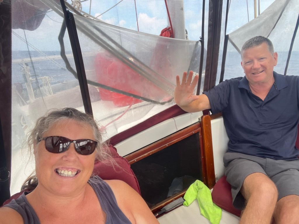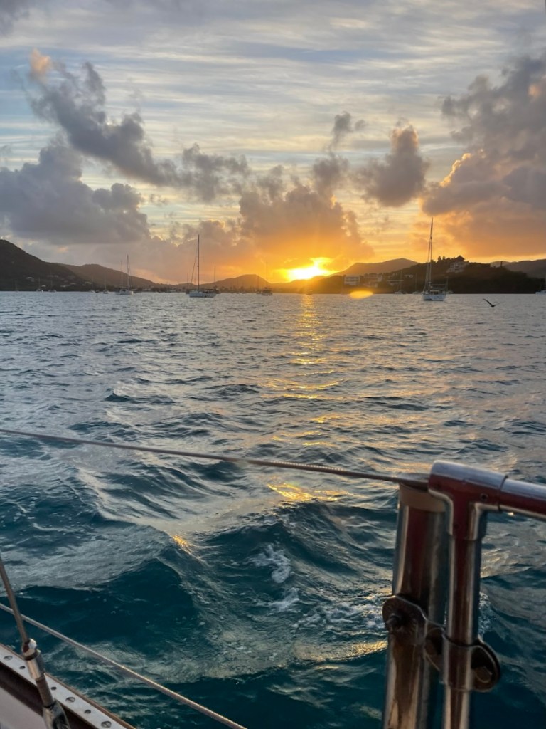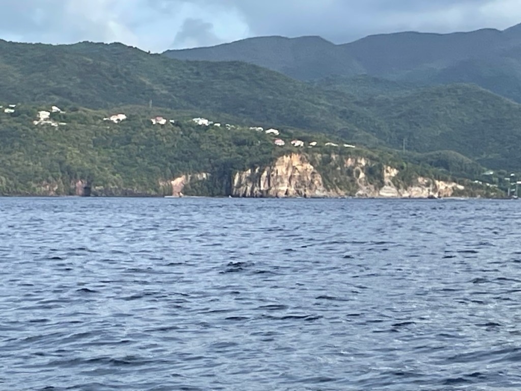 We got going nice and early on March 5th, pulling up anchor at 6:30am. The first part of our crossing was great – we had jib and mizzen up and we were sheltered by Antigua so the waves were tiny. It took a couple of hours until we were out of the protection of Antigua and into the full ocean wind and waves. The wind and waves were slightly ahead of the beam on the port side (on the beam means the wind or waves are 90° to the boat). We were expecting east wind but we were seeing wind slightly south of east (which gave us waves more on the bow then we would have liked). It was a rough, bouncy ride until we were about halfway across (the crossing distance between Antigua and Guadeloupe is about 40nm. Our trip was 60nm because we were going to Bouillante Harbour to meet up with Sharron and John). At that point, the waves changed to being on the beam and the wind was now east/northeast (going behind us!). By this time, Mark was starting to feel slightly better and I was trying to move around as much as I could. By mid afternoon the conditions were much improved and we were sailing along at 6 knots and higher. The wind and waves were behind us and the ride was much smoother. The last part of our trip was easy – we were behind Guadeloupe and protected from the waves. The island impacted the wind direction (more south) so we took sails down and motored the last 8 nm to our anchorage. We arrived around 5 pm and had trouble getting our anchor to hold. After 2 tries in one spot, we thought we were good but our friend John swam over and checked our anchor (super cool of him to do that for us). It turned out we were anchored on top of dead coral and not secure so we moved to a new spot in the anchorage. This time our anchor held – it was after 6 pm when we were finally settled!