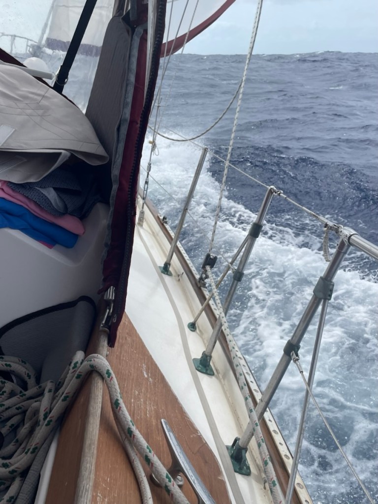 We made it – let’s just start with that!! Our sail down to Guadeloupe was an adventure. We knew the jump was going to be difficult because the predicted winds and waves were high (20 knots with 2.5 m swells) but we had some challenges that made it even harder. When we were leaving the dock on Wednesday (March 4th), I hurt my back trying to untangle a very heavy bow dock line (it wasn’t our line – it came from the boat beside us). So I was not in the best condition for this kind of hard crossing. To add to the pleasure of this trip, Mark had probably his worst bout of seasickness in a very long time. He was wearing the motion sickness watch device but it wasn’t working.