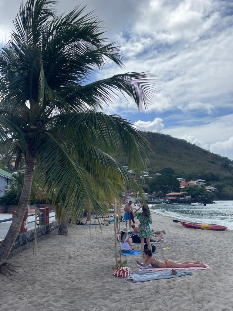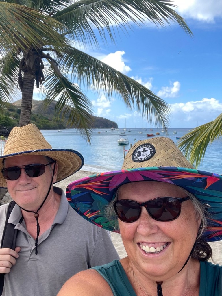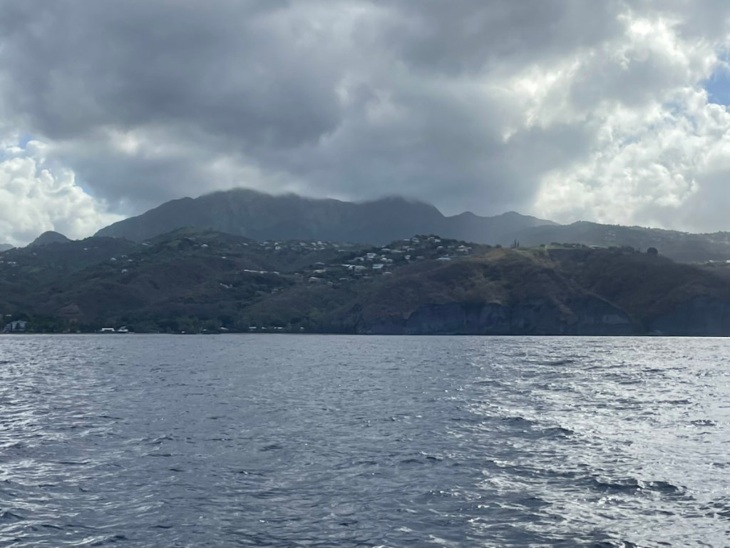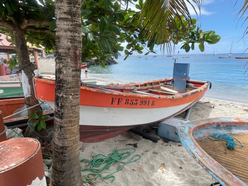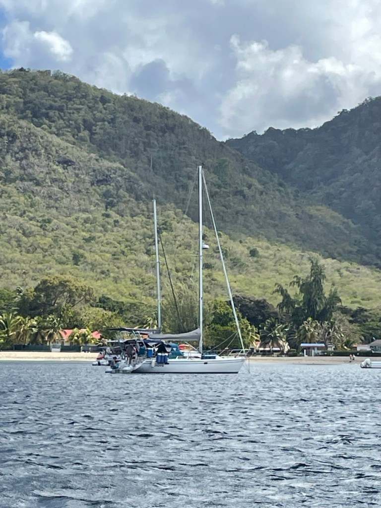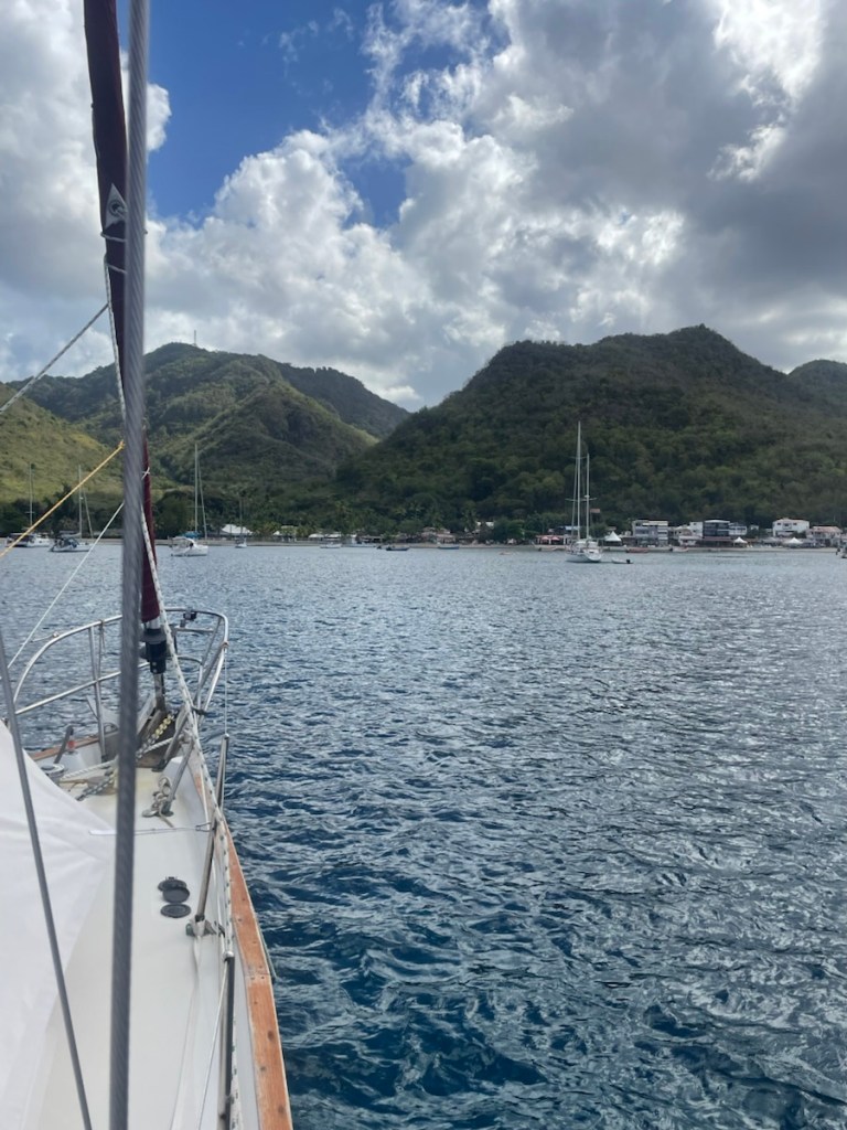After our exploration of St. Pierre on March 14th, we had 2 days of relaxation and some small jobs. It was a rainy, windy day on Sunday, March 15, so we stayed onboard. Monday we went back to town to do laundry and a bit more shopping. We met a couple from Minnesota who had been cruising the Caribbean for 10 years. They told us that this season’s weather has been unusual – more windy and rainy. They also gave us some advice about good places to stop going south – always helpful. On Tuesday, March 17 we pulled up anchor and travelled about 15 nm south to Grande Anse d’Arlet. This move was to put us (and Sundog who sailed down with us) in a better jump off spot for St. Lucia and the area was also known for its charm. It was a short but rough sail south. The wind was all over the place – blowing like crazy from east and then quickly changing strength and direction. We were all pretty tired when we finally anchored in the lovely harbour.
