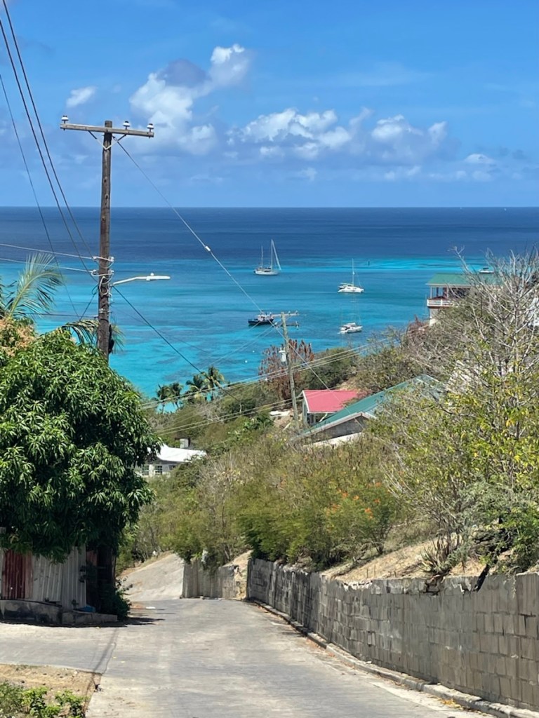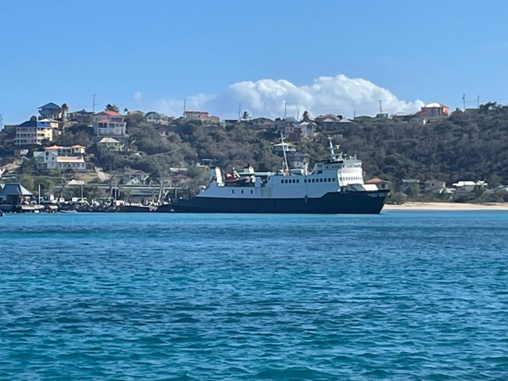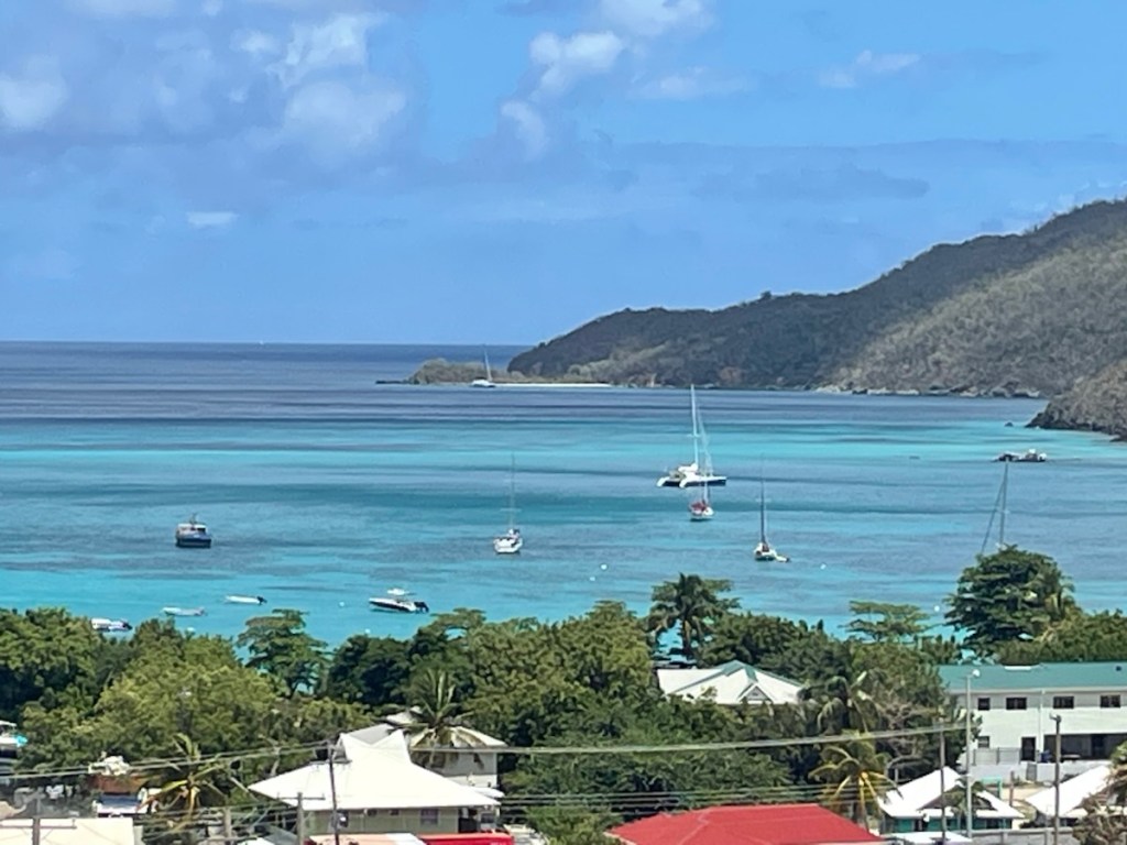 After that stop we told Shireek that we would like to explore on our own and he went back to look after our dinghy. We continued to the east side of the island and walked back around to the main “downtown” area (a couple of restaurants and a few shops). We picked up a few items and had lunch at the cafe in the ferry terminal. Our new friend Shireek met us at the cafe and walked back to our dinghy with us! He wanted euros (not east Caribbean dollars) so we gave him some money and headed back to the boat. We had a nice calm night yesterday (no rolling but lots of gusty wind) and are looking forward to another good sleeping night. Our friends Sharron and John remained at Bequia so they’re keeping us updated. We probably won’t see them again this sailing season but you never know.