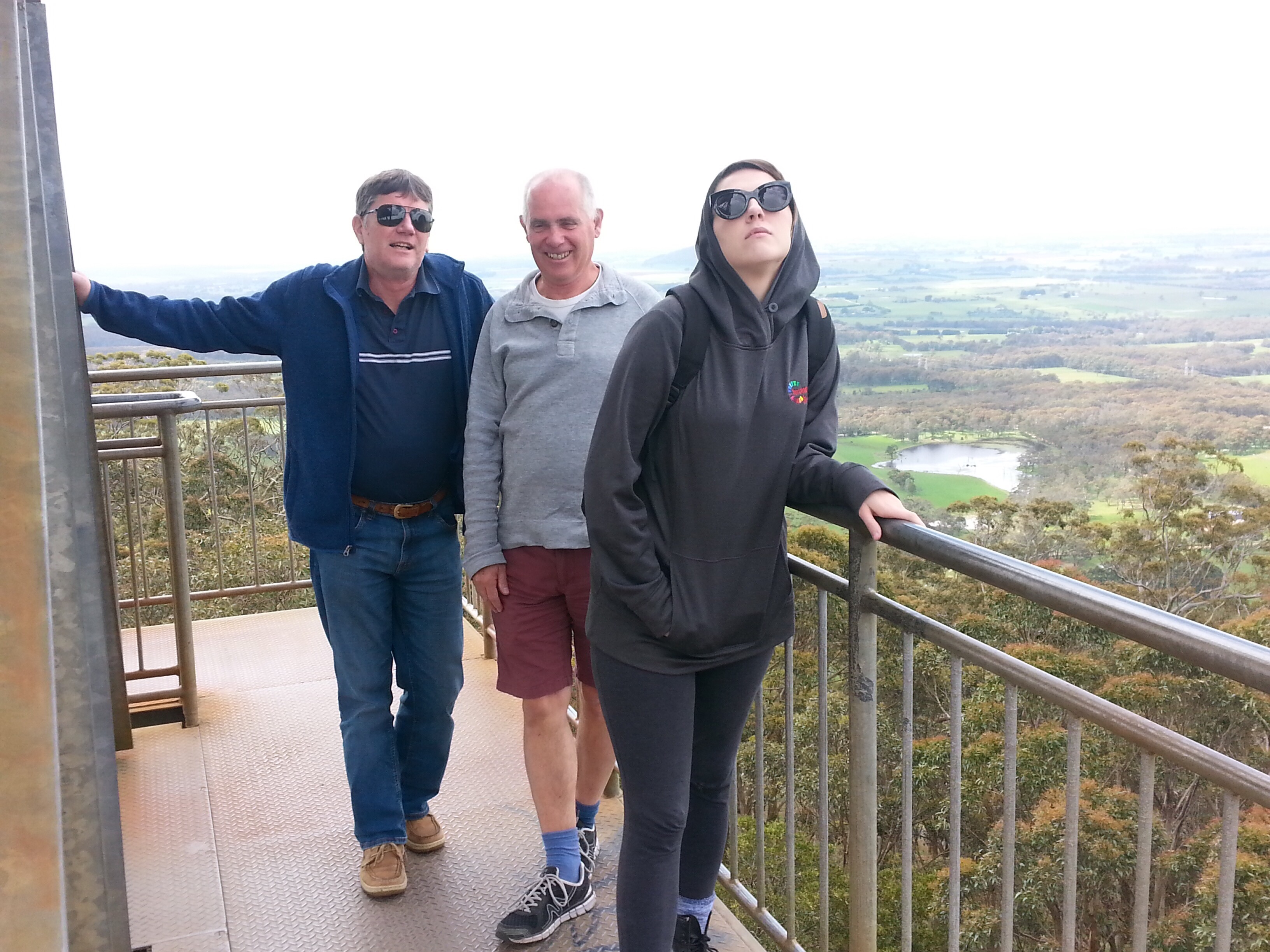 Evelyn and I are posing in front of the lighthouse at Port Fairy (just west of Warnambool).The gang explore the water in Warnambool.The Warnambool shoreline, definitely not Mooloolaba ๐ A close up of one of the “Apostles”.The 12 apostles – or what’s left of them!One of the amazing naturally eroded structures along the Great Ocean Road. Mark and Matthew build rock towers on the rock beach near Apollo Bay.Run before that rock tower gets you.The eastern shore from the top of the Otway Lighthouse.A view of the ocean from the top of the Otway Lighthouse.A cute little wild koala hanging out at the Otway Lighthouse.