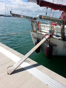 Early morning departure from Palm Beach Gardens.A great run with the spinnaker. As we entered Fort Lauderdale, this cruise ship was leaving the harbour!We waved to all the cruisers aboard as this big ship passed us. Sunrise! We followed that catamaran all the way to Bimini.Getting sails up on the ocean. Early morning again. Our first dinner in the Bahamas – Spanish bubbly and Local lobster tails.Someone is really enjoying that lobster tail!That’s the entrance from the ocean. A bit tense coming in with big waves and shallow water.Browns Marina. Love the colour of the water.