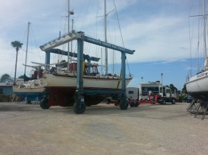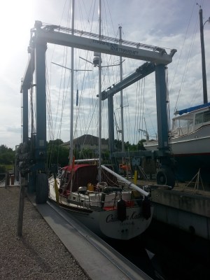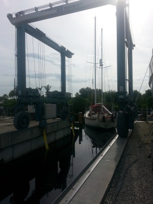 Out of the water and ready for a power wash? Lots of little barnacles on her bottom!