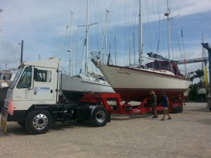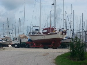 The most interesting thing about this haul out is that our boat is being stored in a yard that is a mile down the road from the haul out site. They used the normal travel lift to get CK out of the water and then put her onto a specialized trailer. This trailer rig drove down the road at a fairly good clip. It was rather disturbing to watch our boat sway back and forth as it went along the road. At one point, the driver, Randy, took a corner sharply and one set of wheels on the trailer went into a pothole – that was scary for us following along behind the boat. But all went well and Crimson Kathryn is now in a very nice spot near the front gate. We have a few more things to do tomorrow but we should be on our way home by Wednesday, July 26.