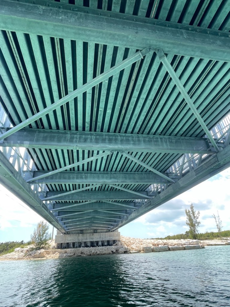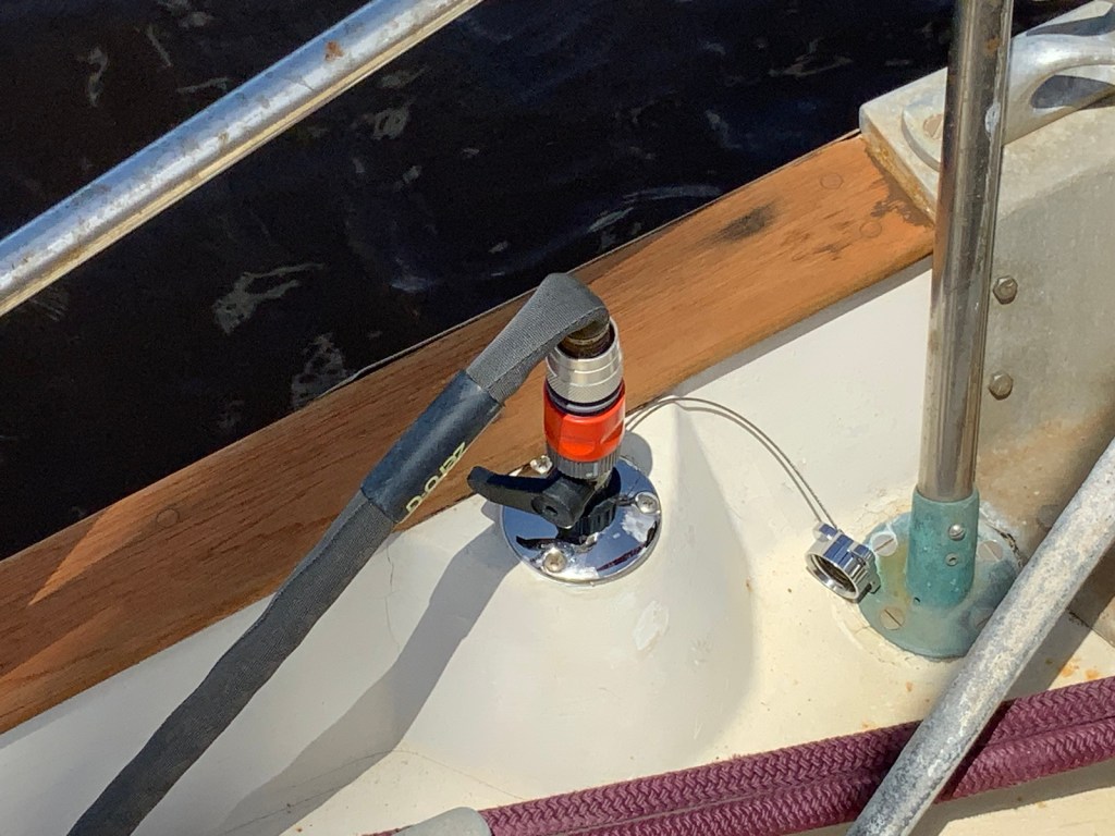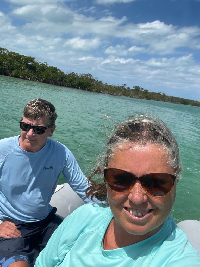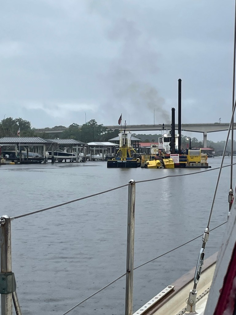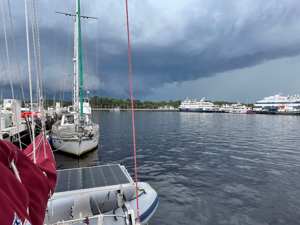 We woke early on Tuesday morning and the wind was down – yippee!! Julia and Brad volunteered to help us get off the pier and then get us onto the haulout dock and they arrived right on time (around 7:30am). Unfortunately we had to get off the pier with a flood tide which meant we were being pushed onto the pier. We were all ready to spring our stern off the pier by keeping a dock line on the bow but the current was so strong that we had a lot of trouble prying off. After several tries, Mark just revved our engine as hard as he could – we blasted (well it is a sailboat so it was a slow blast😁) off the pier. It was crazy!!! I was on the bow looking back to see our solar panel and outboard motor getting closer and closer to the pier as Mark tried to move us away while the current pushed us in!! We made it off but it was tense. We slowed down and headed for the haulout dock where Julia and Brad were waiting to take our lines. It was much easier getting onto this dock because the current was pushing us in but it still was a challenge. Mark did a great job maneuvering around 2 boats at the end of the dock to get us into position for haulout.