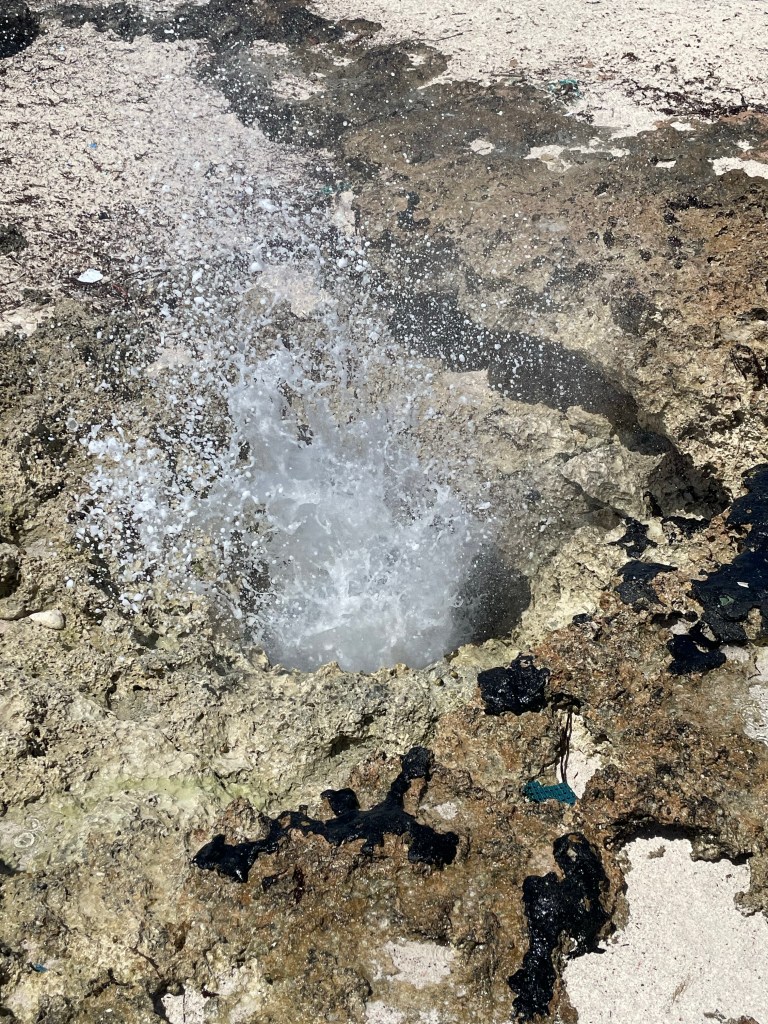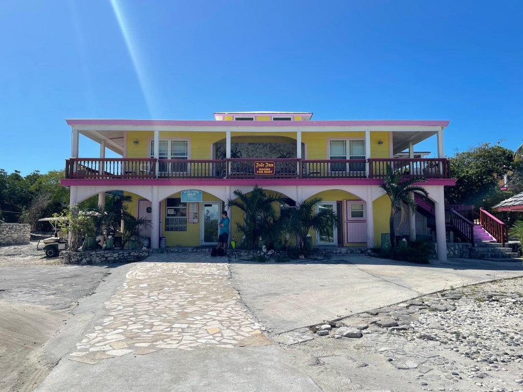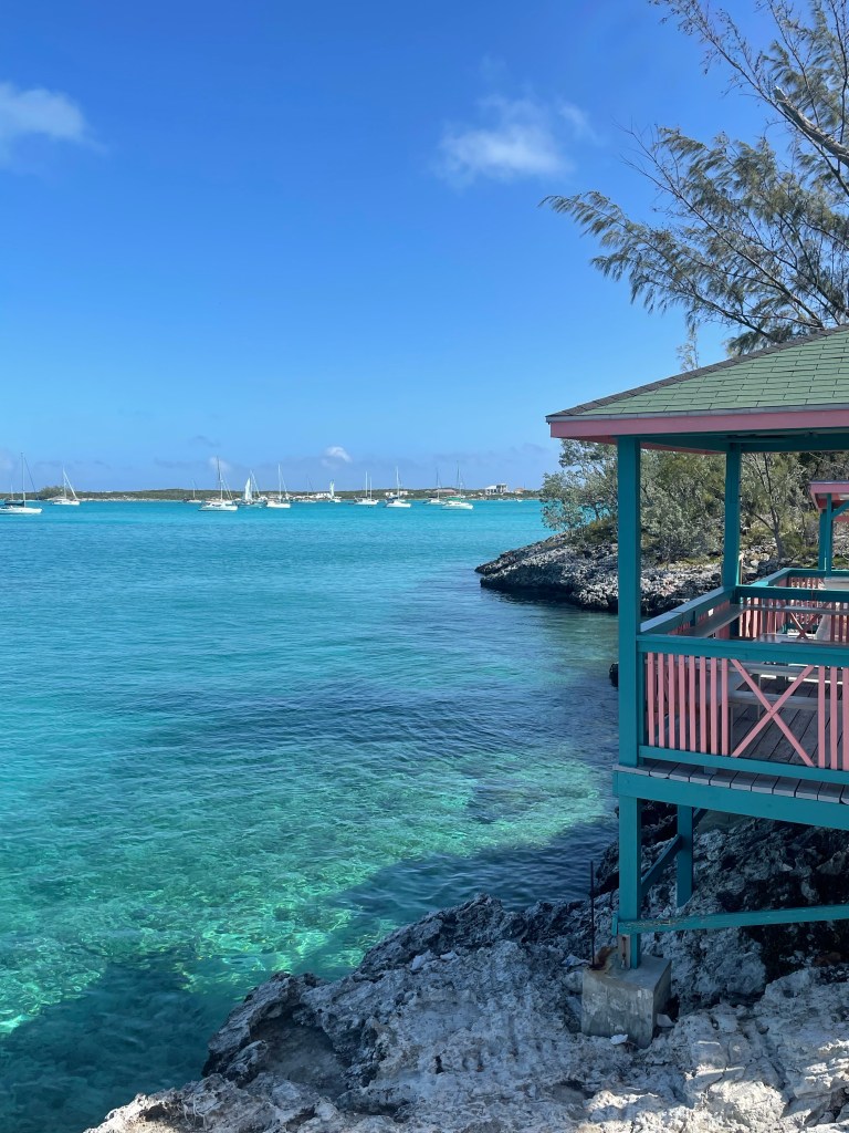 The view from Rockside Laundromat, Black Point.The dock for the laundromat- Mark is taking our few groceries back to the boat while I wait for the washing to be done.You can see the main Black Point anchorage from this spot.We found this awesome blowhole on the north west side of the island, just outside of Black Point.Lots of fun watching the water blow out!!A newer home in Black Point – they love to have bright coloured houses.Staniel Cay Yacht Club lagoon. This is Isles General Store on Staniel Cay. The view from the docks in front of Isles.This is a Bahamian racing sailboat on shore at Staniel Cay.