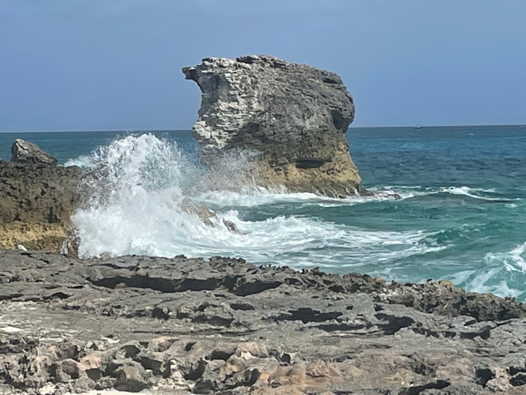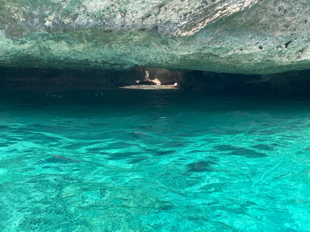 Sunset at White Cay anchorage Saturday, April 2.One of several beaches on Hoffman’s Cay. This one has a trail that leads to a blue hole on the island.After a short walk – we found the blue hole!The trail continued to the water level and this cave.Who could resist swimming!!We’re sailing around Great Harbour Cay, passing the Royal Caribbean cruise ships docked at their private island.This wreck was in this same location 2 years ago!The hidden cut into Great Harbour Cay Marina.